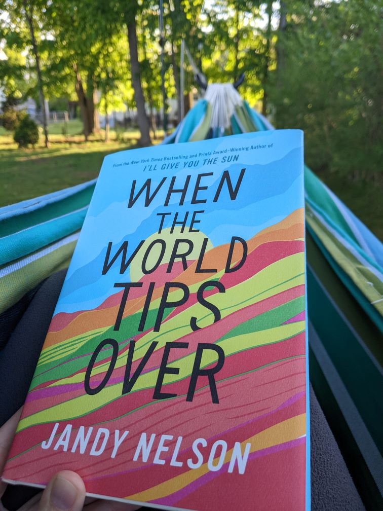 A view of a tree-lined yard from a hammock. The book When the World Tips Over by Jandy Nelson nestled into the hammock, a thumb just visible from a hand holding the book.