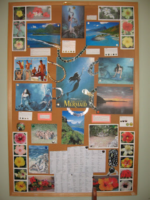 Some of these are from my own photos from Tahiti (where the story takes place), others are Internet images and ones from magazines. The ones with writing on the bottom are English/French/Tahitian translations of popular words and phrases. The other writings are about black-pearl farming (which is the future trade of one of the main characters).